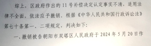 法院经审理认为,区政府参照相关规定作出补偿决定有利于保障被征收人权益,但11号补偿决定存在认定事实不清、适用法律不全面、内容不够具体明确等问题。依据《中华人民共和国行政诉讼法》第七十条第一、二项规定,判决撤销被告作出的11号《征收补偿决定》,责令朝阳市双塔区人民政府于判决生效之日起六十日内重新作出征收补偿决定;案件受理费50元由被告负担。