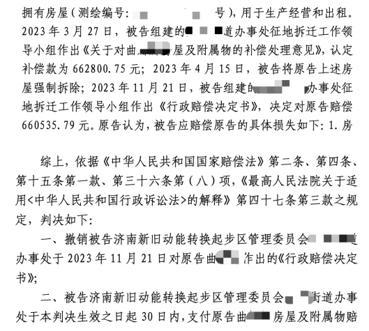 委托人曲女士在济南新旧动能转换起步区某街道某村拥有合法房屋,用于生产经营和出租。然而,街道办事处在未对曲女士就其房屋履行完毕补偿安置职责的情况下,直接实施了违法强拆。京平律师代理曲女士对街道办的违法强拆提起行政诉讼。在诉讼的过程中,街道办主动作出行政赔偿决定。对此,京平拆迁律师及时作出应对,指导曲女士提起行政赔偿诉讼。
