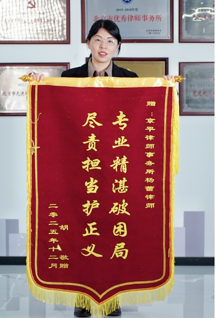 北京胡女士为北京京平律所【杨蕾】律师敬赠锦旗京平律师全国办案,一直在路上