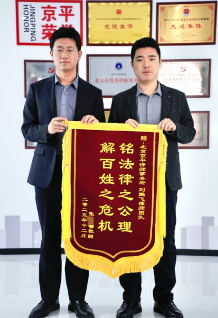 北京张先生为北京京平律师事务所【刘鹏飞】律师、【王立法】律师,敬赠锦旗京平律师,全国办案,一直在路上