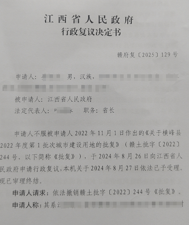 为核实征收行为合法性,他向省自然资源厅申请政府信息公开,于2024年7月31日通过其作出的告知书得知江西省人民政府2022年11月1日作出的《关于横峰县2022年度第1批次城市建设用地的批复》(赣土批字[2022]244号)。他认为省政府作出批复前未获取前置必要文件、未核实征收范围和申报项目名称,且未依法听证,程序违法,故申请行政复议,请求撤销该批复。