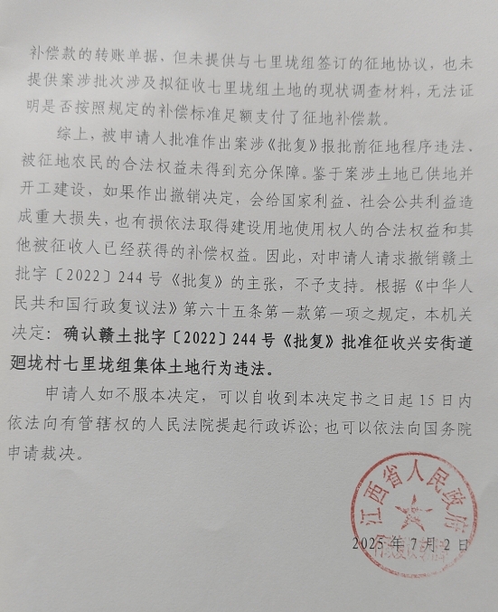 但鉴于案涉土地已供地并开工建设,撤销批复会给国家利益、社会公共利益造成重大损失,也会损害相关方合法权益,故依据《中华人民共和国行政复议法》第六十五条第一款第一项规定,确认赣土批字〔2022〕244号《批复》批准征收兴安街道廻垅村七里垅组集体土地行为违法。