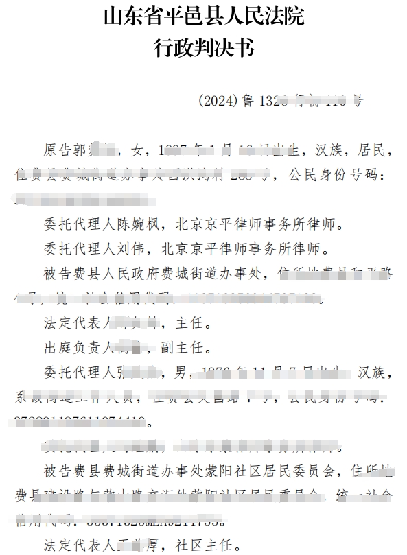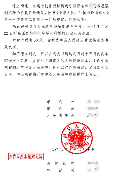 【胜诉判决】法院经审理认为,虽然蒙阳社区居委会自认拆除房屋,但根据相关法律规定和在案证据,应认定系费城街道办组织实施了拆除行为。费城街道办未提供证据证明其拆除行为履行了法定程序,故确认被告费县人民政府费城街道办事处于2024年5月22日拆除原告郭女士房屋及附属的行政行为违法。案件受理费50元由被告费城街道办负担。