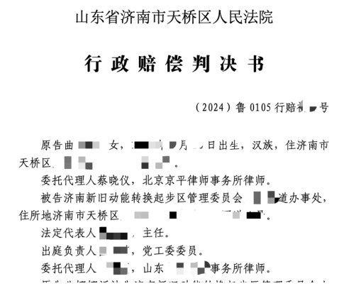 京平律师凭借丰富的拆迁维权经验,通过分析街道办作出的赔偿决定,认为其存在诸多不合理之处。李敏杰律师和蔡晓仪律师针对此赔偿决定果断指导曲女士向济南市天桥区人民法院提起行政赔偿诉讼。天桥区法院顺利受理案件,并进行了开庭审理。在庭审中,京平律师律师明确指出街道办作出的赔偿决定不应低于被拆迁人原应获得拆迁补偿权益。具体而言,该赔偿决定中关于房屋本身的赔偿价格过低,未能合理反映房屋的实际价值;搬迁费补偿也明显不足,无法满足曲女士实际搬迁所产生的费用;更为关键的是,赔偿决定遗漏了拆迁奖励等本应属于曲女士应得的赔偿项目。京平律师紧紧围绕这些要点,据理力争,力求为曲女士争取到合理合法的赔偿。