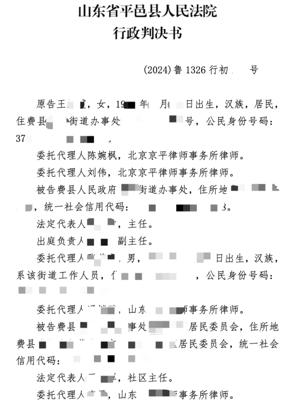 两位京平拆迁律师接到求助后,凭借丰富的拆迁维权经验和专业知识,对案情进行了深入分析,并指导委托人收集、整理证据。在充分准备的基础上,律师以费县某街道办事处为被告,向法院提起行政诉讼,请求确认强拆行为违法。然而街道办为了推脱自己的责任,申请居委会作为被告参加诉讼。庭审中,两被告相互配合,居委会自认其为强拆主体。对此,京平律师给予了有力的回击。京平律师庭上指出居委会作为自治组织,并非行政主体,依法不具有强制搬迁的法定职责,居委会的拆除行为本质上是受行政机关委托或指示,其法律后果应当由行政机关承担。并且,京平通过指导王女士提供的证据,清晰地证明了本次拆迁补偿安置主体正是街道办,进一步明确了街道办应当为强拆行为承担法律责任。最终,法院采纳了京平律师的观点,作出了公正判决。