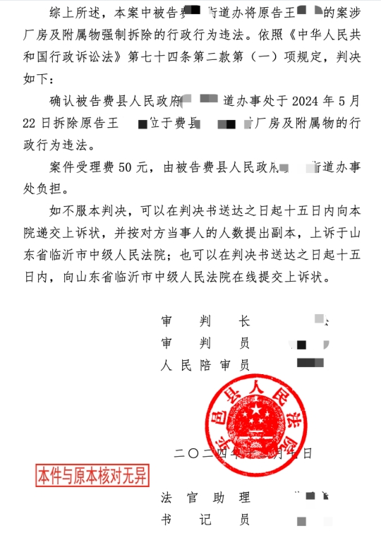 山东厂房拆迁胜诉案例:居委会自认强拆,街道办仍被确认强拆违法